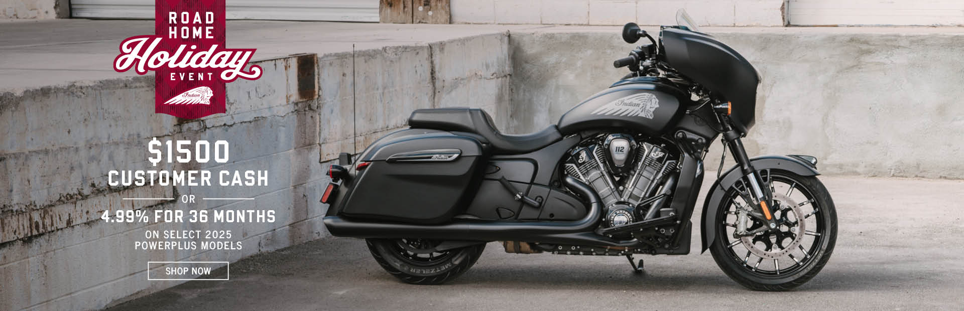 This is a limited time offer which consists of $1,500 Customer Cash rebate towards the purchase of new model year 2025 Chieftain PowerPlus, Chieftain PowerPlus Limited, Roadmaster PowerPlus Dark Horse or Roadmaster PowerPlus Limited models. This offer is subject to change and may be extended or terminated without further notice. Offer may not be combined with promotional financing offers. All rebates paid to dealer and are not redeemable for cash. Offer Valid: December 1 – 31, 2025. Expires: 12/31/2025
